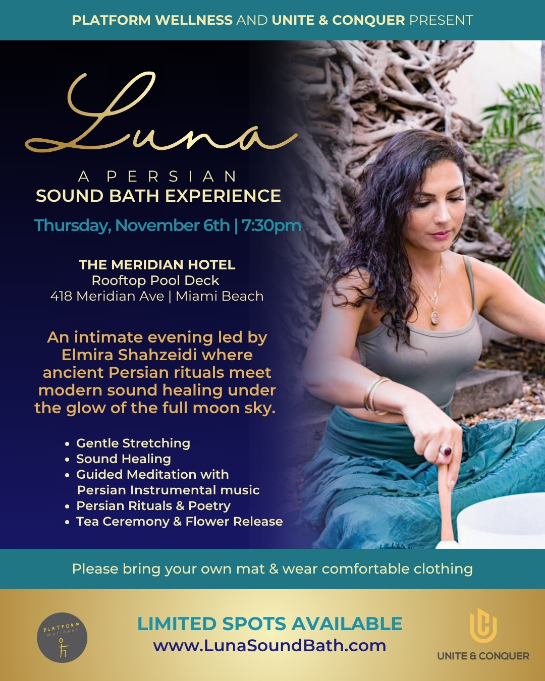 LUNA is more than a sound bath, it’s an immersive Persian‑inspired healing experience designed to transport you into a mystical realm of renewal. A gentle sound‑healing journey to soften the heart, calm the body, and guide you back to yourself. Come settle into the frequency of peace. 💫🎶